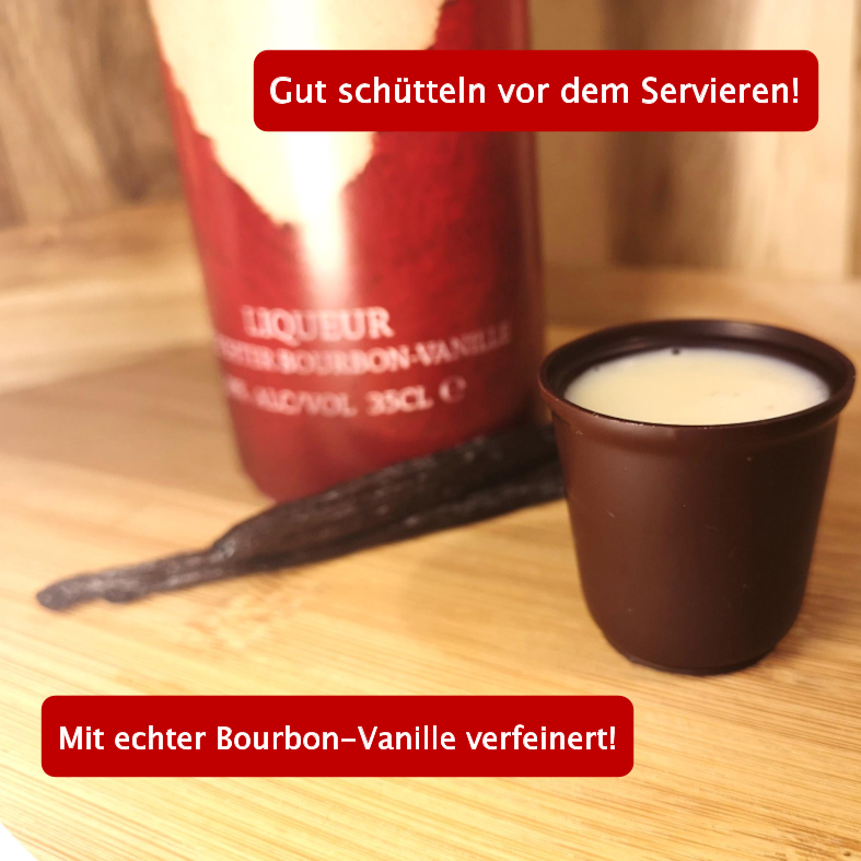 GRATIS: 12 knackige Schokobecher aus feinster Zartbitterschokolade (60 % Kakao im Schokoladenanteil) von der Halloren Schokoladenfabrik – perfekt zum Servieren des cremigen VEIER-Likörs.